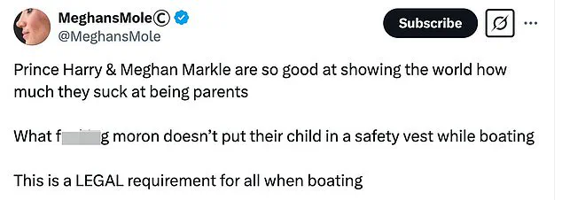 The criticism continued: ‘A child on a boat without a lifejacket makes me cringe,’ wrote one person. Another tweet read, ‘We’ve had several drownings in our state for that very reason.’ These comments highlight the perceived danger and legal non-compliance of Harry and Meghan’s actions.