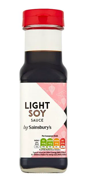 Sainsbury’s 59p light soy sauce also includes a range of ingredients: 15 per cent soy sauce, sugar, salt, plain caramel, and the preservative potassium sorbate. By contrast, Kikkoman soy sauce, which costs around £3, contains only water, soybeans, wheat, and salt — making it one of the least processed options available.