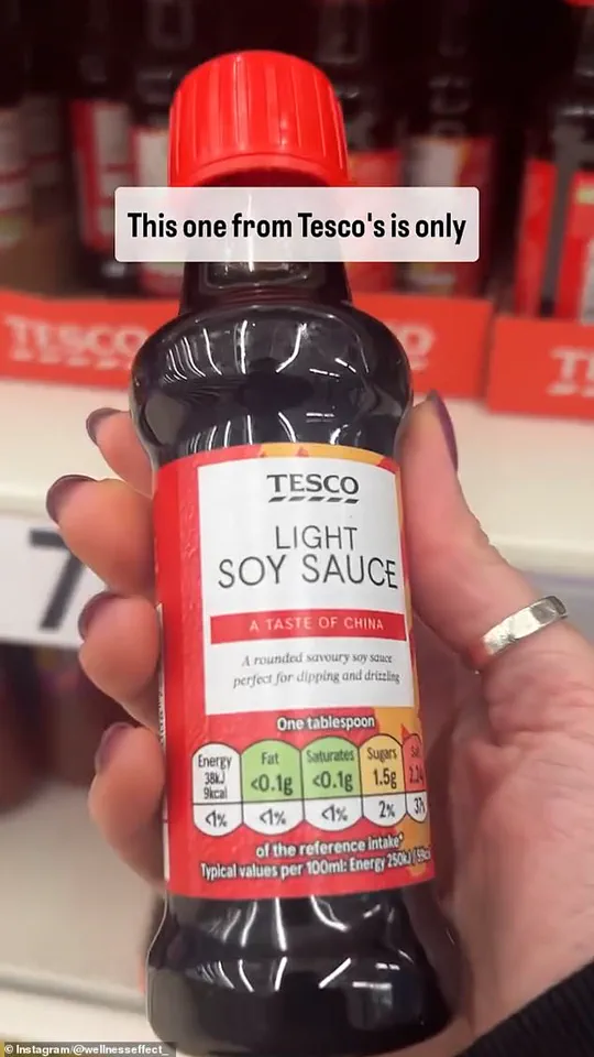 In a viral video, Helen, a nutrition health coach who boasts 79,000 Instagram followers (@wellnesseffect_), visited Tesco to scout out its soy sauce offerings. She held up the supermarket’s own-brand ‘light soy sauce’ bottle to camera and revealed that it contains only 20 per cent soy sauce extract. The rest is water, salt, three different types of sugar, and additives.