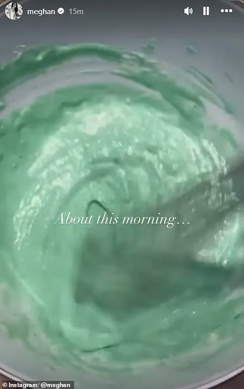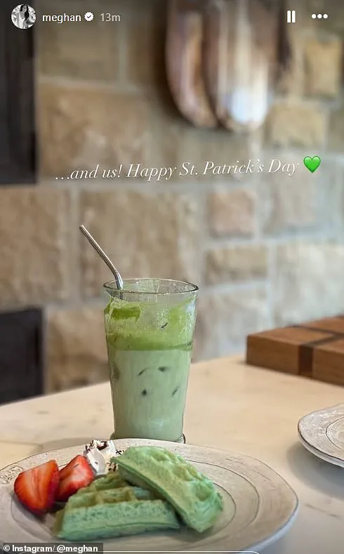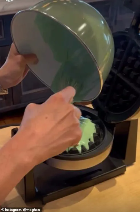 In one of her Instagram videos, Meghan filmed herself whisking up green waffle batter, pouring it into the waffle maker. She also made a green glass of milk to stay on theme, finishing off with a sprinkle of salt and laughing as she put the final touches on the children’s whimsical treats.