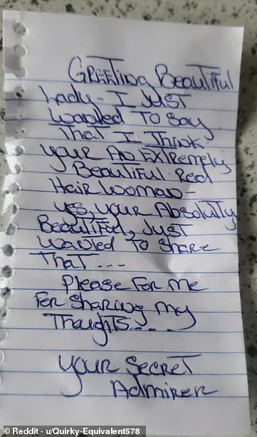 The note read: ‘Greeting Beautiful Lady. I just wanted to say that I think you’re an extremely beautiful red-haired woman – yes, you’re absolutely beautiful, just wanted to share that… Please for me for sharing my thoughts… Your secret admirer.’ The message was both complimentary and unsettling, sending the recipient into a state of paranoia.