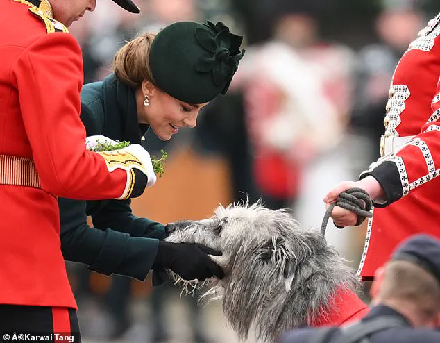 In one of the most touching moments of the day, Kate knelt down to pet Turlough Mór, the regimental mascot Irish Wolfhound known as Seamus. This simple act highlighted the Princess’s affection for both the animals and her troops.