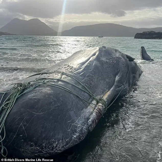 The team quickly dispatched marine mammal medics to Raasay. They found that some ropes were wrapped around the animal’s jaw and head. A local resident attempted to cut away the remaining ropes from the whale, which was still breathing.