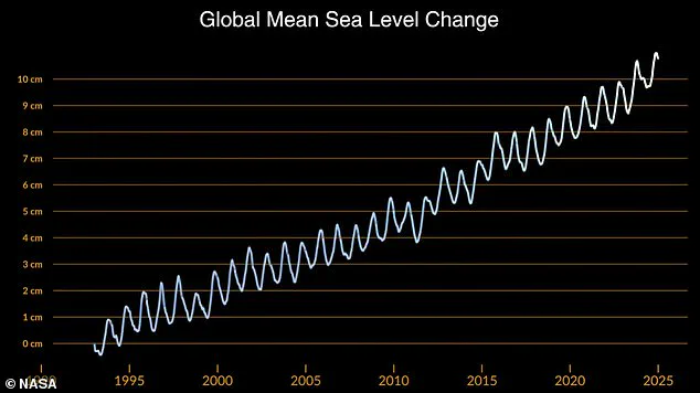 Josh Willis, a sea level researcher at NASA’s Jet Propulsion Laboratory in Southern California, commented on the findings: ‘The rise we saw in 2024 was higher than we expected… Every year is a little bit different, but what’s clear is that the ocean continues to rise and the rate of rise is getting faster and faster.’