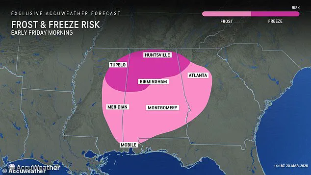 Weather officials have issued urgent freeze warnings in Georgia, Mississippi, and Alabama ahead of a sharp drop in temperatures tonight, signaling another unwelcome wave of cold weather as spring approaches. Freezing temperatures are expected to hit the northern portions of these states overnight and persist through Friday morning.