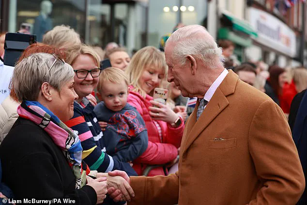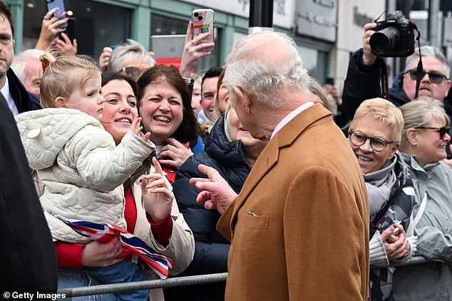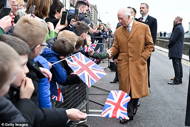 As they navigated through crowds of wellwishers brandishing Union Jacks, Charles exchanged pleasantries with children holding flags and locals alike. One notable moment saw Camilla carefully plucking a daffodil from the bouquet offered to her and tucking it neatly into Charles’s lapel, adding a vibrant touch that highlighted their connection and mutual support.