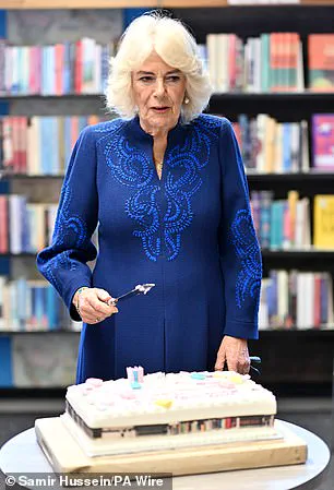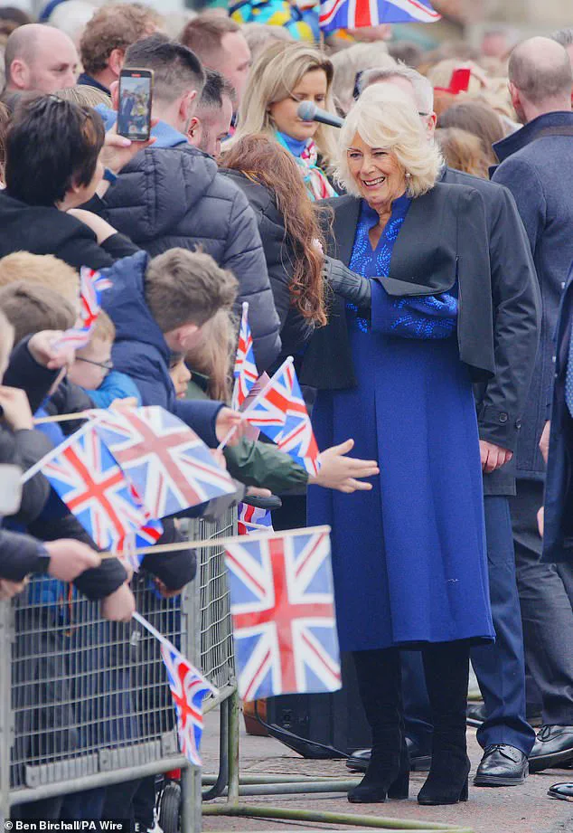 To mark the conclusion of this joyous event, Camilla was invited to cut a cake from a local bakery, adding a sweet note to the day’s proceedings. The Queen’s choice of attire for the visit was elegant yet approachable; she wore a sapphire blue dress that stood out against Banbridge’s typically overcast skies. Her platinum blonde hair was styled in its signature look, and her black suede boots complemented her sophisticated appearance.