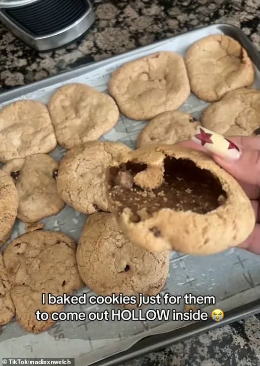 A woman has left TikTok users in awe after she posted a video of her peculiar homemade cookies that were entirely hollow inside, leaving both baking enthusiasts and professionals utterly perplexed. User @madisxnwelch shared the unusual treats on the platform earlier this week, setting the tone with the Titanic flute fail audio clip. She described her predicament succinctly: ‘I never claimed to be a baker, but WTF is this,’ pointing out that each cookie had an empty cavity inside.
