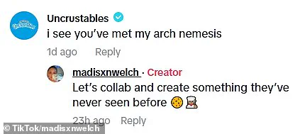 TikTok users also reached out to older videos of @madisxnwelch in an attempt to gather more information about her baking technique. One user asked: ‘Girl how did you make the boneless cookies?!’, while another requested a tutorial and said: ‘I’m here to talk about the boneless cookie recipe?!!’ The brand Uncrustables, known for its unique sandwich products, also chimed in with their own take on her creation: ‘I see you’ve met my arch nemesis.’ In response, @madisxnwelch jokingly suggested a collaboration with them and stated: ‘Let’s collab and create something they’ve never seen before.’