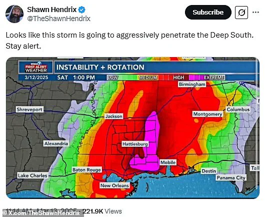 This part of the map, highlighted in pink, indicated the most extreme segment of the approaching system slated to impact the region over the weekend. Social media users quickly took notice and began sharing humorous observations about the graphic’s unusual appearance. One X user noted, ‘Looks like this storm is going to aggressively penetrate the Deep South. Stay alert,’ with the comment receiving over 300 replies.