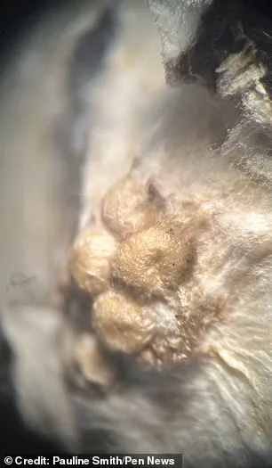 She continued: ‘On returning home, I was excited to look at the nest and eggs in more detail using a hand lens and microscope, and I took some photos. Sadly, I also found a squashed hatchling spider when I looked more closely under the microscope.