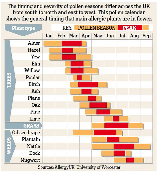 She explains: ‘Trees that produce allergic pollen in the UK tend to have alternating high and low years of severity – this year is a high year.’ This is due to a phenomenon known as ‘masting’, where some trees produce less pollen one year to have the energy to produce an abundance the following one.