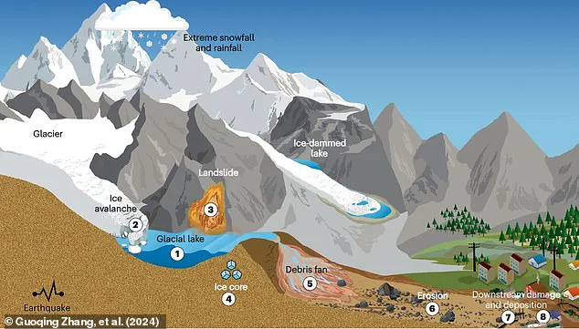 This water often collects in depressions left behind by retreating glaciers, forming large lakes that are precarious and unstable, held back by natural dams composed of rock and ice deposited over centuries.