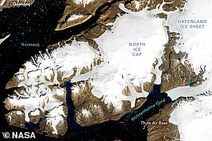 In Greenland, satellite evidence clearly shows how the glaciers have darkened and shrunk between 1973 (left) and 2022 (right).