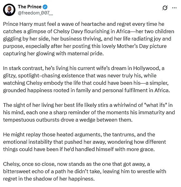 A fan called ‘The Prince’ speculated: ‘Prince Harry must feel a wave of heartache and regret every time he catches a glimpse of Chelsy Davy flourishing in Africa—her two children giggling by her side, her business thriving, and her life radiating joy and purpose.’