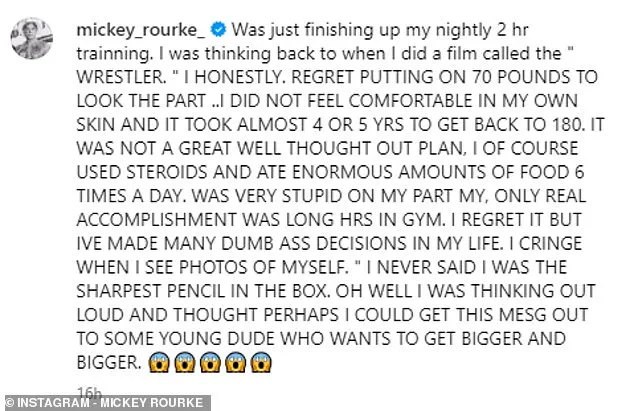 Mickey Rourke, the enigmatic actor known for his gritty roles and tumultuous career, recently took to Instagram to reflect on a regrettable chapter in his life.