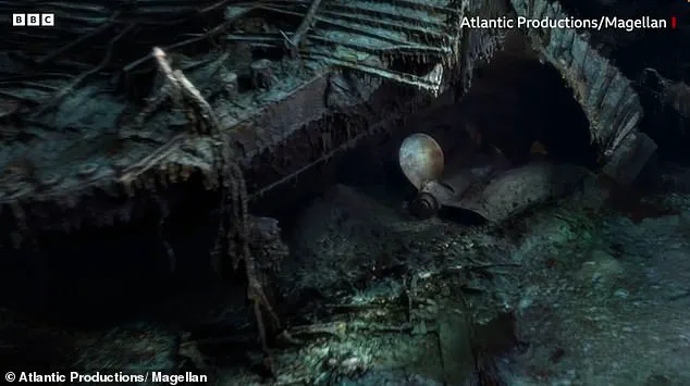 This image released in 2023 shows stalactites of rust on the ship’s bow, the serial number on a propeller, and a hole over where the grand staircase once stood.