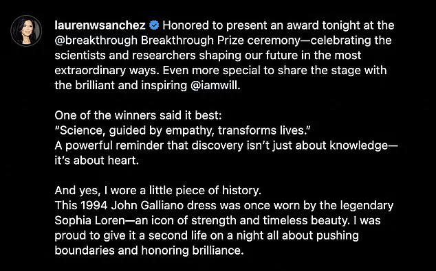 I was proud to give it a second life on a night all about pushing boundaries and honoring brilliance.’ Lauren, 55, who is heading to space on Monday (April 14) aboard one of her fiance’s Blue Origin rockets alongside Katy Perry and Gayle King, accessorized her vintage gown for the ‘Oscars of Science’ with an astronaut bag by designer Judith Leiber.