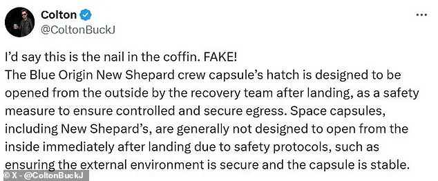 Another conspiracy theorist called this ‘the nail in the coffin’ and falsely claimed that the New Shepard capsule could not be opened from the inside.