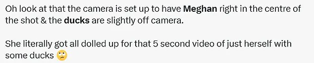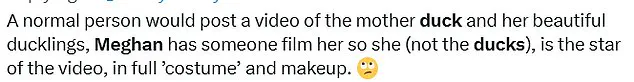 Some viewers were quick to point out the suspicious nature of Meghan’s footage, suggesting it was more than just chance she came across these ducks.