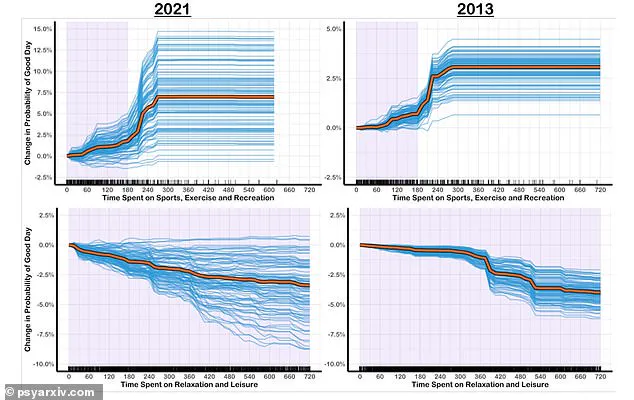 Time spent on sports, exercise and recreation (top) was associated with having a good day in both 2021 and 2013 – but not relaxation and leisure (bottom) which included screen time