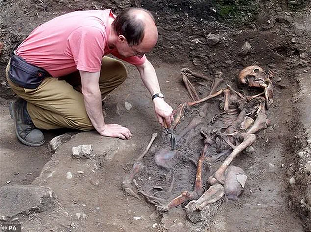 Kurt Hunter-Mann, a field officer at York Archaeological Trust, examines a skeleton unearthed at the site in York