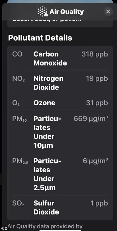 One person revealed on X that they had received an air quality alert message on their phone, warning that ‘everyone is even more likely to experience serious health effects.’ Another person on X shared a message from their son, showing that Chicago’s air was inundated with both carbon monoxide and PM10—meaning particulate matter with a diameter of 10 micrometers or smaller.