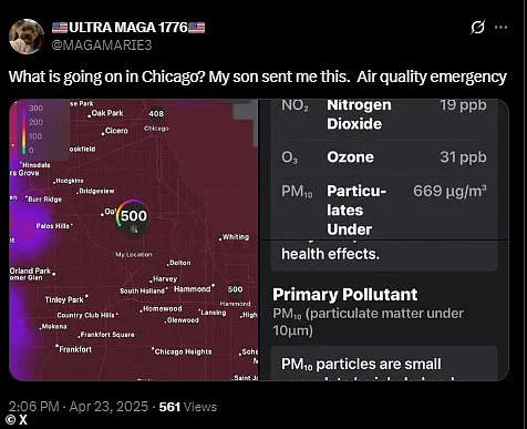 Chicago’s reported PM10 concentration of 669 µg/m³ (micrograms per cubic meter) was extremely bad and fell into the ‘Hazardous’ category of the Air Quality Index, indicating serious health risks for everyone.