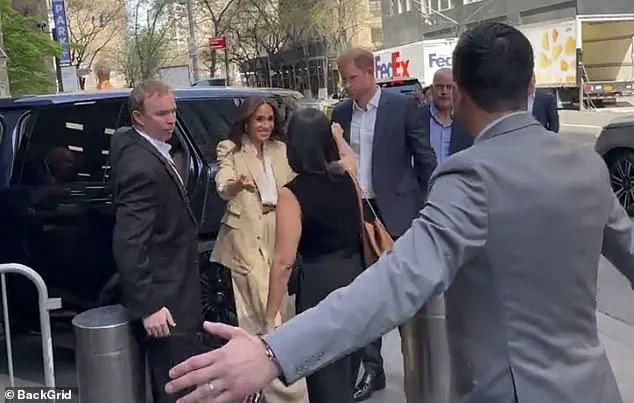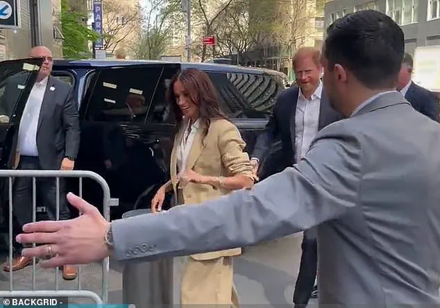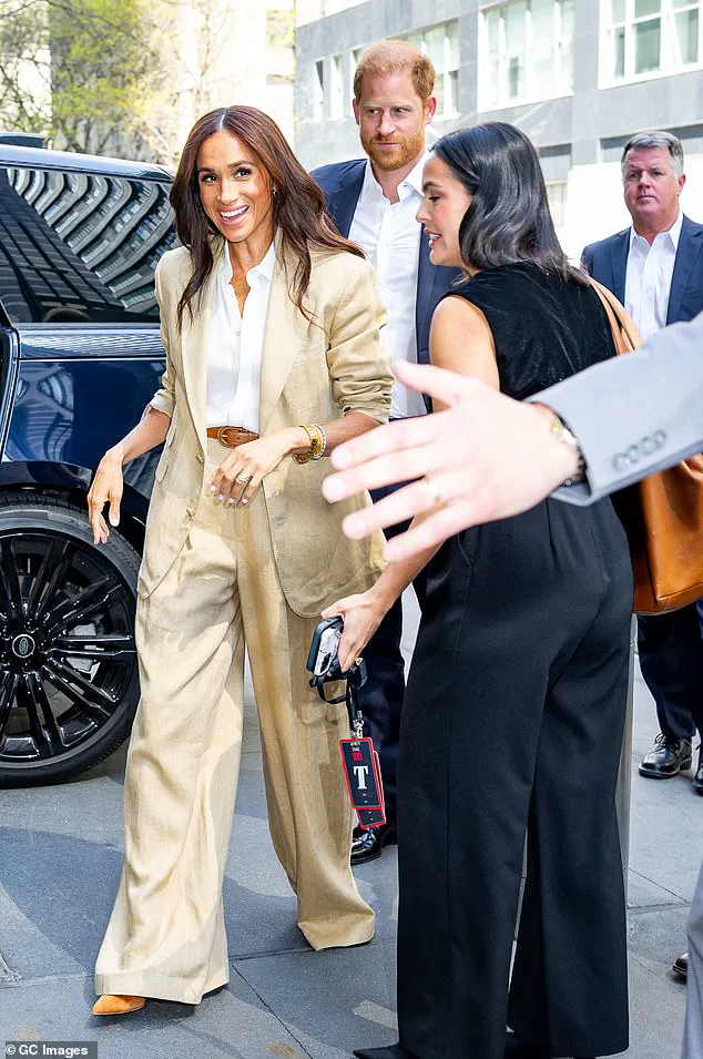 Moments later, the mother-of-two was so busy waving to crowds as she entered the building that, when Harry reached out to her once more, he was again left trailing behind.