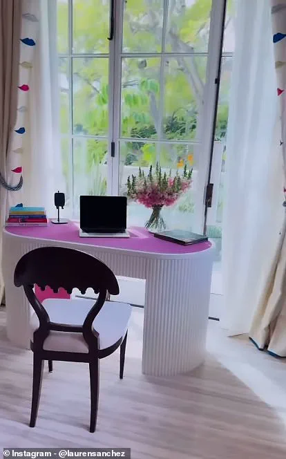 In the brief video, Lauren showcased her luxurious writing nook, which revealed a white beveled writing desk with a bright pink surface situated in front of a huge patio door.