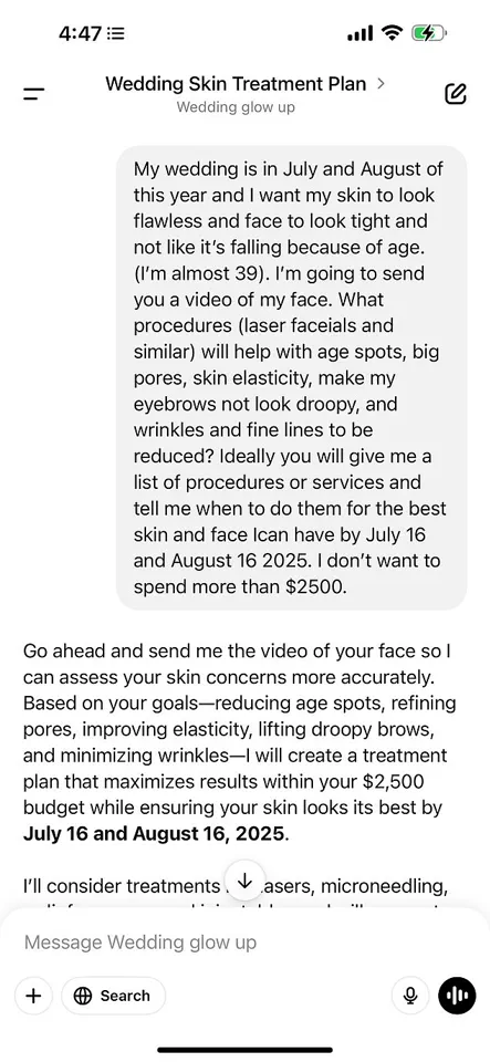 ChatGPT responded with a ‘month-by-month game plan,’ which included initial consultations, small-impact procedures early on, and procedures requiring downtime scheduled at least 90 days before the wedding.