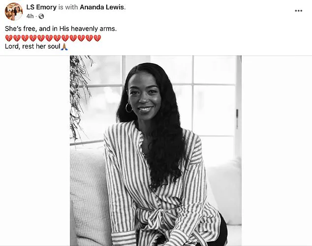 Her death was announced by her sister, Lakshmi Emory, through a heartfelt Facebook post that described her as now ‘free, and in His heavenly arms.’ The message, signed with ‘Lord, rest her soul,’ underscored the spiritual and emotional closure her family sought in the wake of her passing.