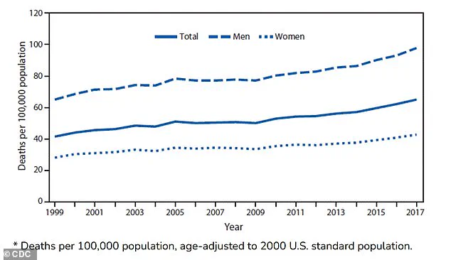 Death rates have surged from 42 to 65 per 100,000 between 1999 and 2017.