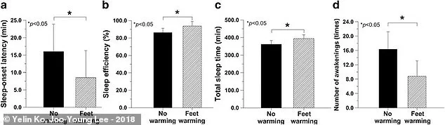 This graph shows how warm feet reduce the time taken to fall asleep and the number of awakenings while increasing sleep efficiency and time spent asleep.