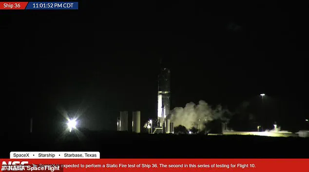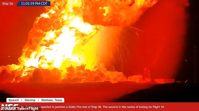 The Starship 36 rocket was undergoing a static fire test at Elon Musk’s Starbase test site at around 11pm when shocking footage shows its nose suddenly bursts open—causing the screen to momentarily flash white.