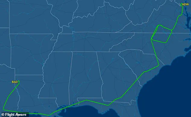 The craft took off from Shreveport at 5:56pm ET, traveled along the coast, looped around the border of Virginia and North Carolina, before landing at Joint Base Andrews at 10:01pm.