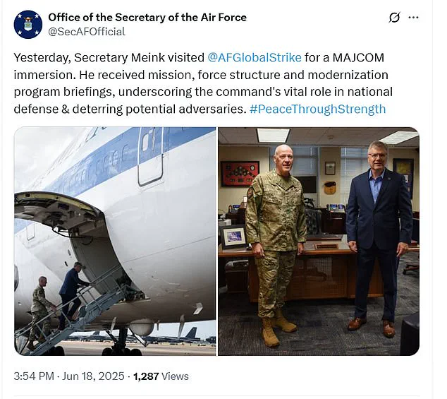 The post explained that Secretary Meink visited Air Force Global Strike Command (AFGSC) yesterday for a Major Command (MAJCOM) immersion, a deep, firsthand overview of the command’s operations.