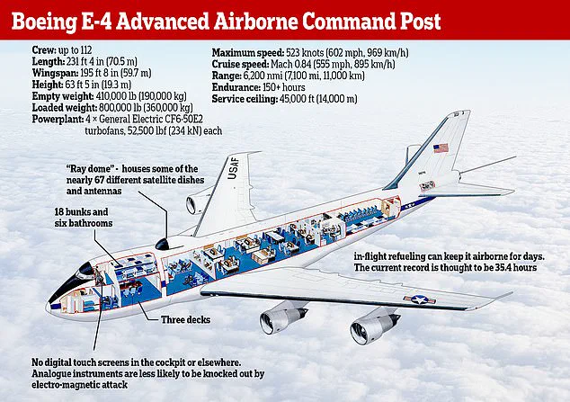 The E-4B, often referred to as the ‘Doomsday Plane,’ has long been a symbol of the United States’ nuclear readiness, though its deployment in recent weeks has raised questions about the scale of the crisis and the administration’s contingency planning.
