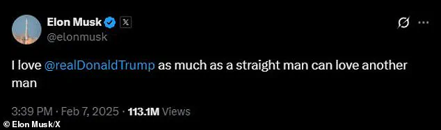 In February 2024, Musk posted a message that encapsulated the nature of their relationship: ‘I love Donald Trump as much as a straight man can love another man.’ This statement, while controversial, reflects a broader cultural phenomenon of male camaraderie and admiration that has permeated various aspects of public life.