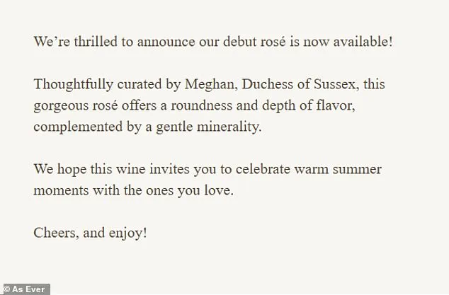 Despite the backlash, Meghan has remained unshaken, insisting that her wine is a celebration of ‘elevating the ordinary.’ Yet the mixed reactions from consumers and royal fans alike suggest that her vision of ‘elevation’ may be more about self-promotion than about delivering a product that truly stands out.