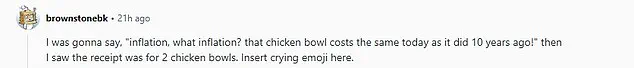 That chicken bowl costs the same today as it did 10 years ago!’ one user wrote, only to later realize the receipt was for two bowls. ‘Insert crying emoji here,’ they added, highlighting the emotional impact of such a stark comparison.