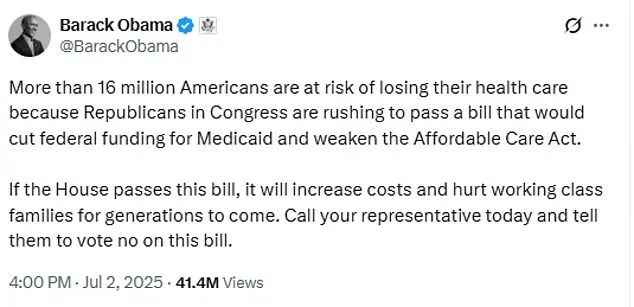 The bill, which included significant spending measures, became a focal point of Obama’s criticisms, with the former president highlighting its potential impact on healthcare access.