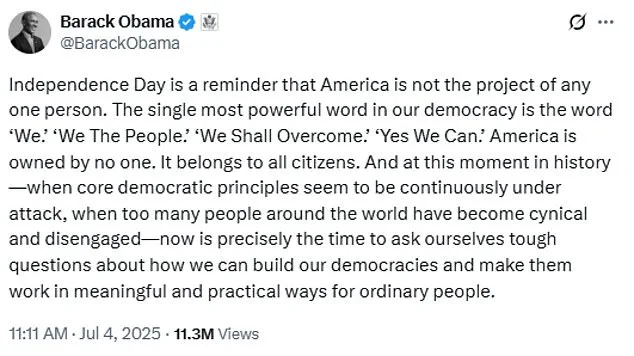 The timing of these statements—coinciding with the Fourth of July—added a layer of symbolic weight to Obama’s message.