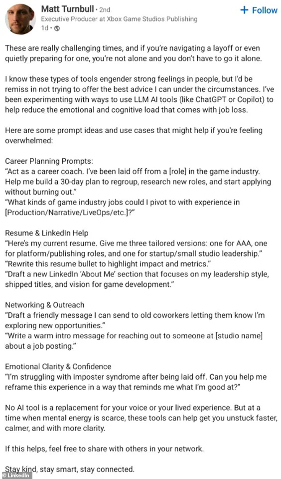 Matt Turnbull, an executive producer at Xbox Game Studios Publishing, posted AI-generated prompts to LinkedIn offering laid-off workers help with career planning, résumé writing, and even emotional support