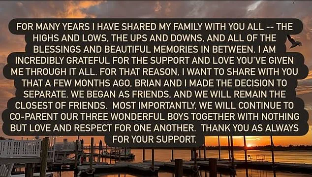 Dreyer emphasized that the decision to separate was made ‘a few months ago’ and that Brian and she had chosen to ‘remain the closest of friends.’ She also stressed that their commitment to co-parenting their three sons — Calvin ‘Cal’ Bradley, 8; Oliver ‘Ollie’ George, 5; and Russell ‘Rusty’ James, 3 — would remain unwavering. ‘Most importantly, we will continue to co-parent our three wonderful boys together with nothing but love and respect for one another,’ she wrote, a sentiment echoed by a source close to the family, who described the split as ‘amicable.’