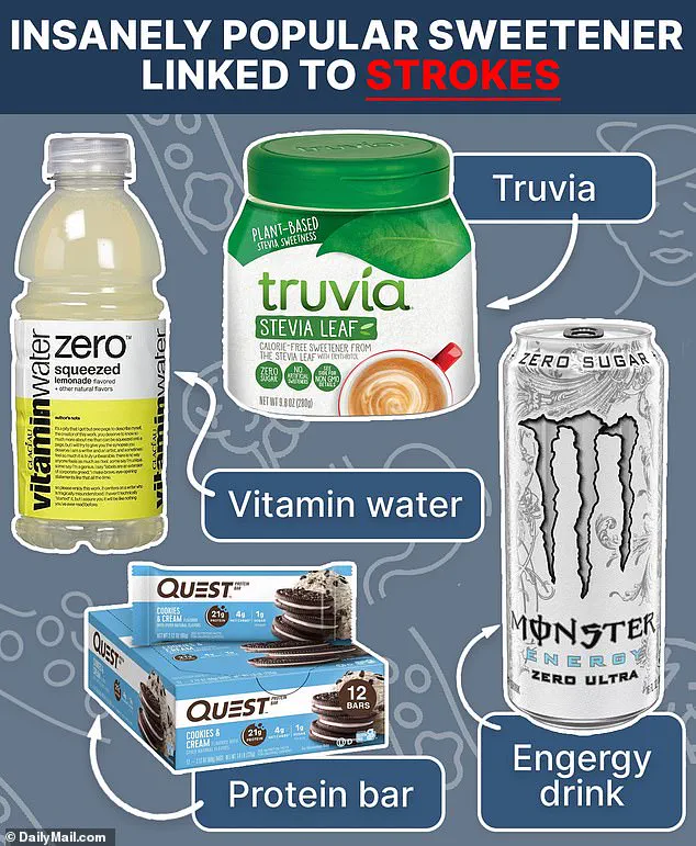 While acknowledging that more research is needed to fully understand its long-term effects, he recommended that patients ‘ditch the erythritol’ and opt for plain fizzy drinks or non-sweet alternatives. ‘Erythritol is not the sugar-free savior we once believed it to be,’ he warned. ‘It’s a novel chemical in high doses, and the data now strongly suggests it can tighten your vessels, fuel oxidative stress, and promote clots—all ingredients for stroke and vascular damage.’