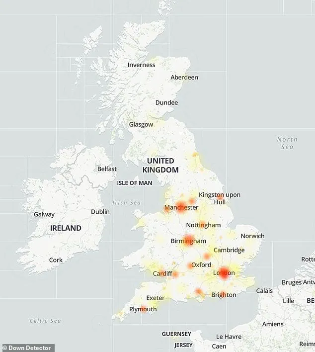 The outage was not confined to a single region; according to the platform’s interactive map, customers in major UK cities such as Manchester, Birmingham, Nottingham, and London all reported similar issues, highlighting the national scale of the problem.