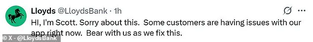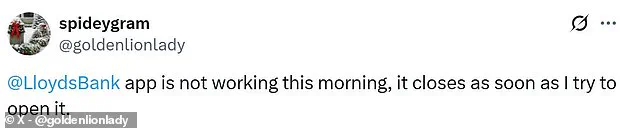One user, visibly exasperated, posted on social media: ‘My banking app will not let me log in and I need to pay some bills.’ Another, more scathingly direct, wrote: ‘@LloydsBank are a joke.