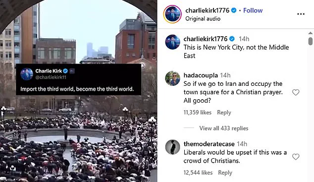 Charlie Kirk, a prominent Trump loyalist and political activist, has ignited a firestorm of controversy after sharing a video on social media that depicted hundreds of Muslims praying in New York City’s Washington Square Park.