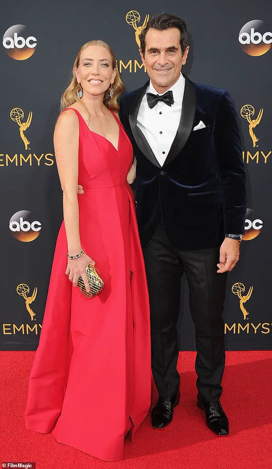 When we look back on that, we’re like, because we brought a photo of you to include you in all the family pictures and we were like, “well yeah it does sort of look like we were having a memorial for you.”‘ Ty married his wife Holly Burrell in 2000 (pictured at the 68th Annual Primetime Emmy Awards in 2016).